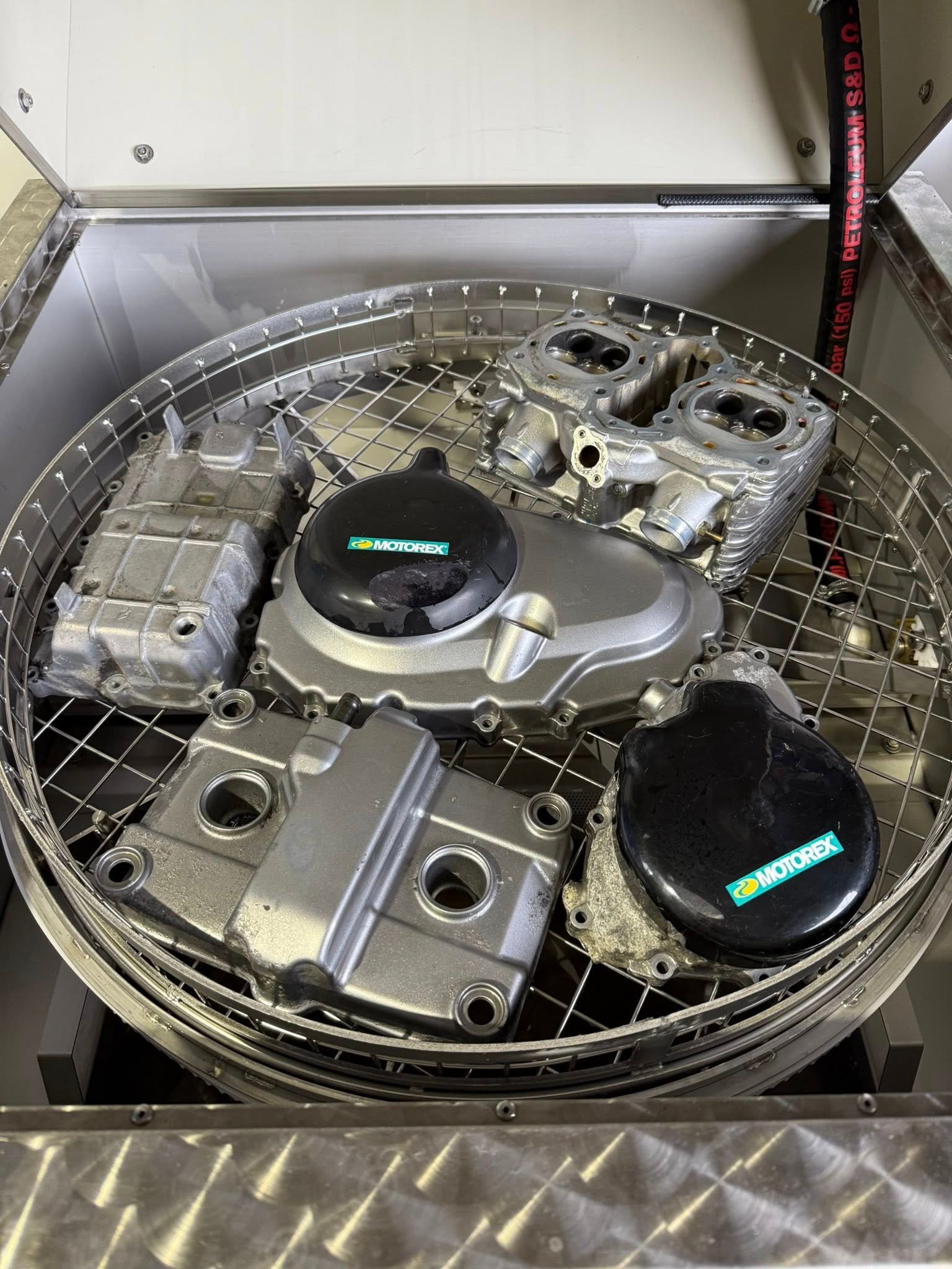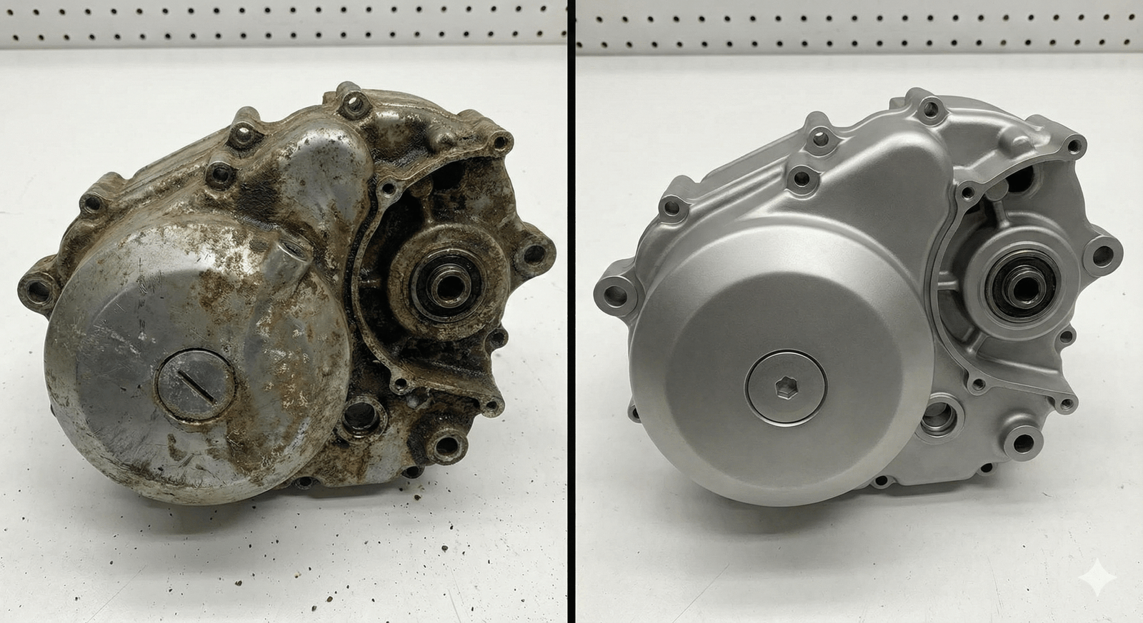 The Factory Finish Don’t let grime hide the potential of your machine. Our in-house vapor blasting service restores aluminum, magnesium, and titanium parts to a “better-than-new” satin finish. Unlike dry blasting, our wet process is non-aggressive—cleaning engine cases, carburetors, and suspension components without altering critical dimensions or bearing fits. Get the factory look, ready for the race track.